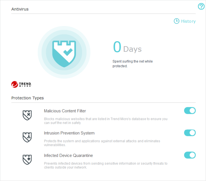 Your router supports built-in Antivirus powered by Trend MicroTM. It provides malicious content filtering and intrusion prevention for your home network, as well as a quarantine for infected devices. An active database protects every connected device from external threats.