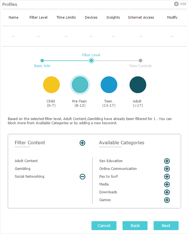 1 )Select a filter level based on the age of the family member this profile belongs to. Blocked content will then be displayed in the Filter Content list.