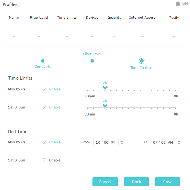 2 )Enable Bed Time on Monday to Friday and use the up/down arrows or enter times in the fields. Devices under this profile will be unable to access the internet during this time period.
