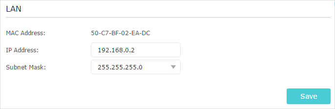 1 )Go to Advanced > Network > LAN, configure the IP address of the extended router to be in the same subnet with the root router; (For example, the IP address of the root router is 192.168.0.1, the IP address of the extended router can be 192.168.0.2~192.168.0.254. We take 192.168.0.2 as example.)