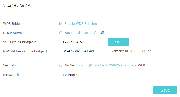 1 )Go to Advanced > System Tools > System Parameters and focus on the 2.4GHz WDS section, click Enable WDS Bridging.