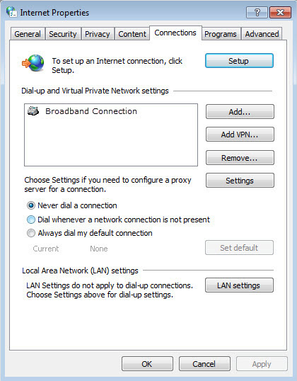 3 )Click Connections and select Never dial a connection.