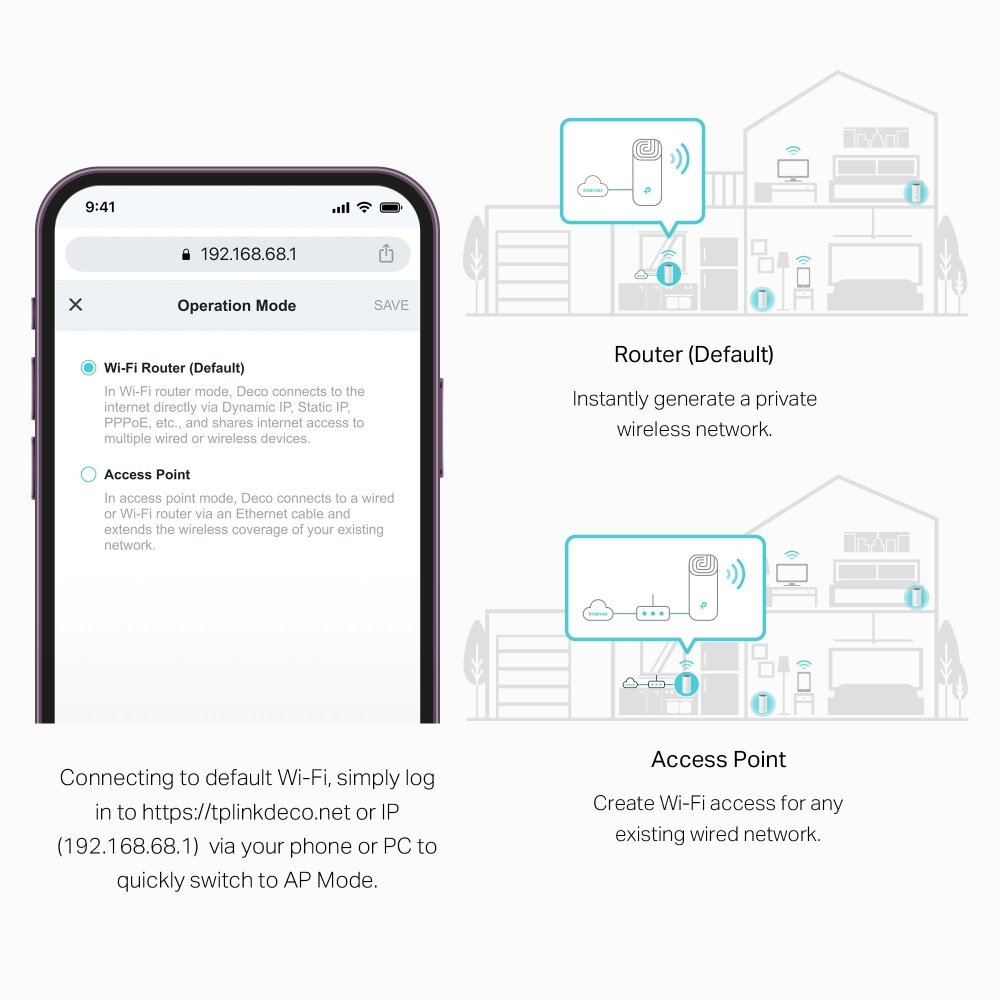 Linh hoạt và đa chức năng, Deco E4 bao gồm nhiều tính năng cho phép nó hoạt động như một router hoặc access point. Chỉ cần chọn chế độ phù hợp với nhu cầu mạng thực tế của bạn và trải nghiệm sự linh hoạt không dây tối đa.