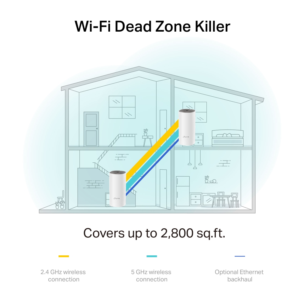 Deco E4 là cách đơn giản nhất để đảm bảo tín hiệu Wi-Fi mạnh mẽ ở mọi góc nhà của bạn lên đến 140m2 (1-pack). Kết nối wireless và tùy chọn Ethernet backhaul hoạt động cùng nhau để liên kết các unit Deco, cung cấp tốc độ mạng thậm chí nhanh hơn và vùng phủ sóng (coverage) thực sự liền mạch. Muốn vùng phủ sóng rộng hơn? Chỉ cần thêm một Deco khác.