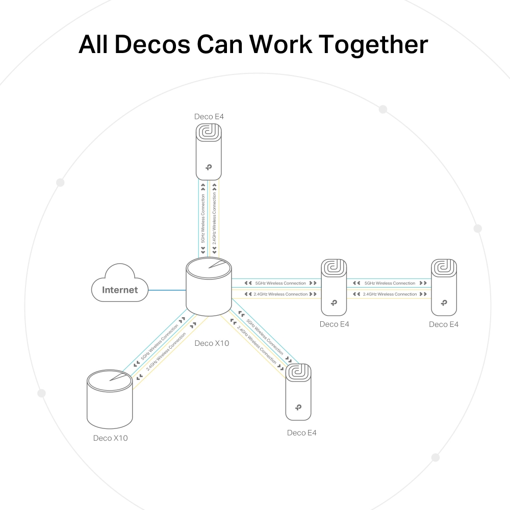 - Với Công nghệ Deco Mesh tiên tiến, các unit hoạt động cùng nhau để tạo thành một mạng thống nhất với một tên mạng duy nhất. Thiết bị tự động chuyển đổi giữa các Decos khi bạn di chuyển trong nhà để đạt được tốc độ nhanh nhất có thể.
