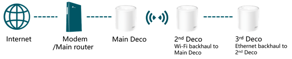 - Ethernet Backhaul kết nối các đơn vị Deco qua cáp Ethernet để có hiệu suất nhanh và tin cậy hơn Wi-Fi Backhaul. Wi-Fi Backhaul sẽ tự động ngắt kết nối khi Ethernet Backhaul được thiết lập thành công.