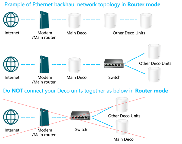 - Chế độ Router: Các bộ Deco phụ (Satellite) phải kết nối với cổng LAN của Deco chính (Main), hoặc kết nối với một switch đã được nối vào cổng LAN của Deco chính để tránh hiện tượng vòng lặp mạng (network loop).