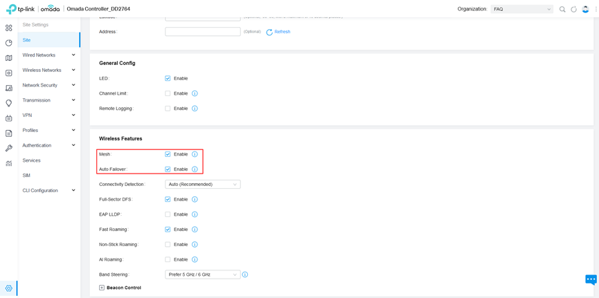 Bước 1. Đăng nhập vào Controller, vào Settings > Site > Wireless Features để xác nhận rằng Mesh và Auto Failover đều đã được bật.