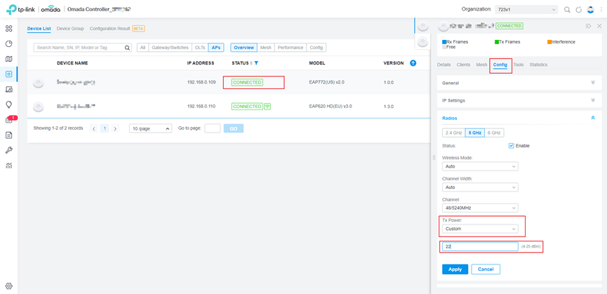 - Đăng nhập Controller, vào Devices > Config > Radios > Tx Power và điều chỉnh về giá trị phù hợp.