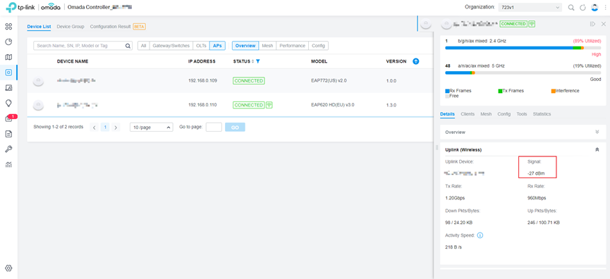 Bước 5. Nếu Mesh AP có thể tự động kết nối trở lại, hãy kiểm tra cường độ tín hiệu trên Omada Controller. Nhấn vào Mesh AP đó, bạn sẽ thấy mức tín hiệu giữa nó và AP uplink của nó.