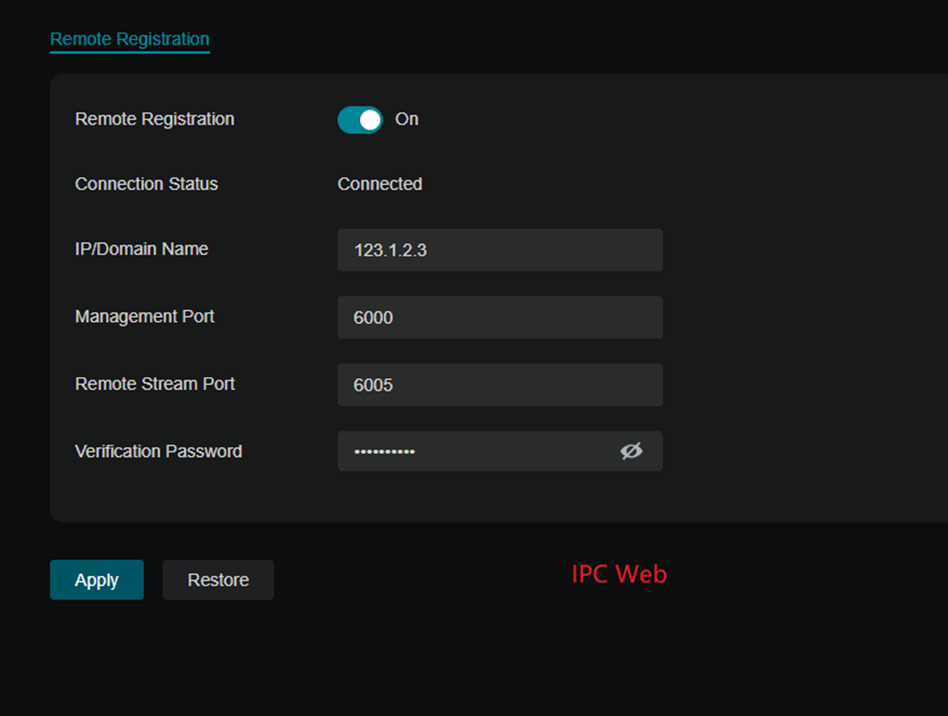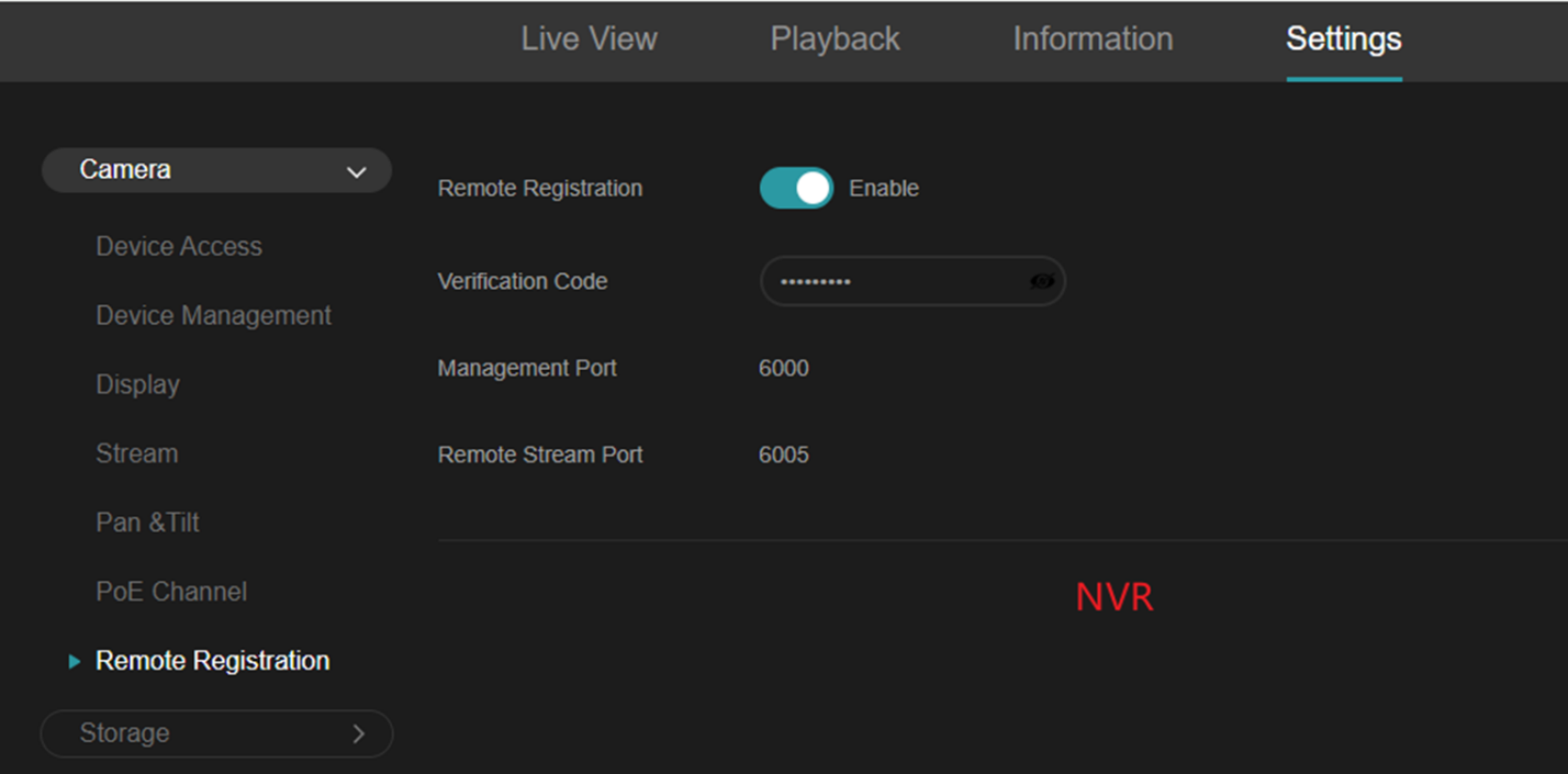 Vào Settings > Camera > Remote Registration, bật tính năng Remote Registration và cấu hình Verification Code (mã xác thực).