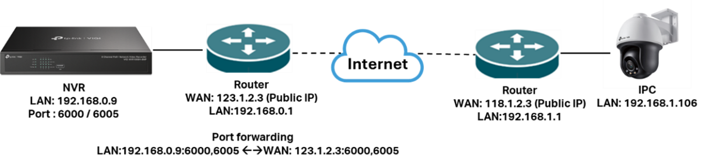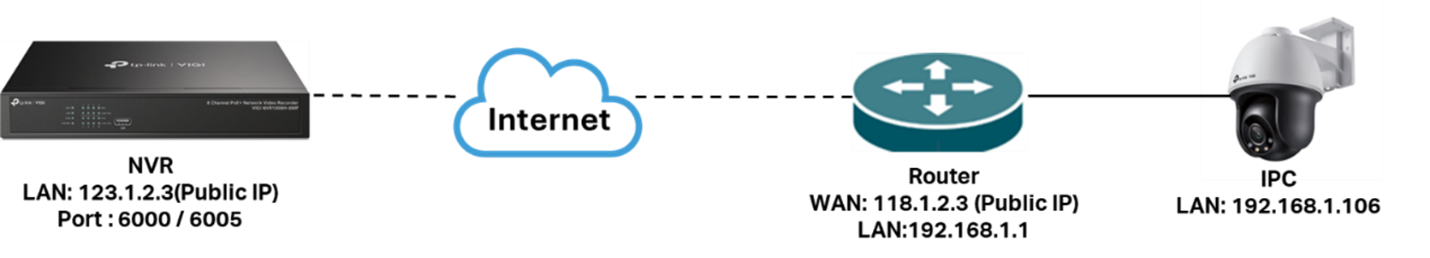 Địa chỉ IP của NVR là IP Private. Router kết nối với NVR phải có IP Public. Đồng thời, router cần ánh xạ (map) Management Port và Remote Stream Port ra mạng Internet bằng UPnP hoặc các phương pháp khác (ví dụ: tính năng Port Forwarding trên router).