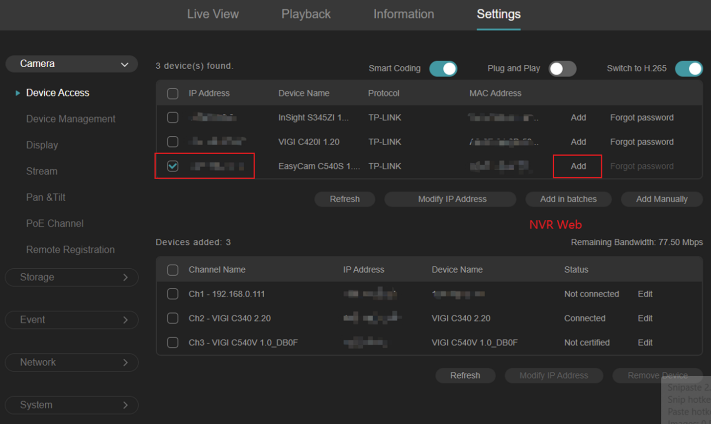 Vào Settings > Camera > Device Access và thêm IPC vào giao diện NVR Web.