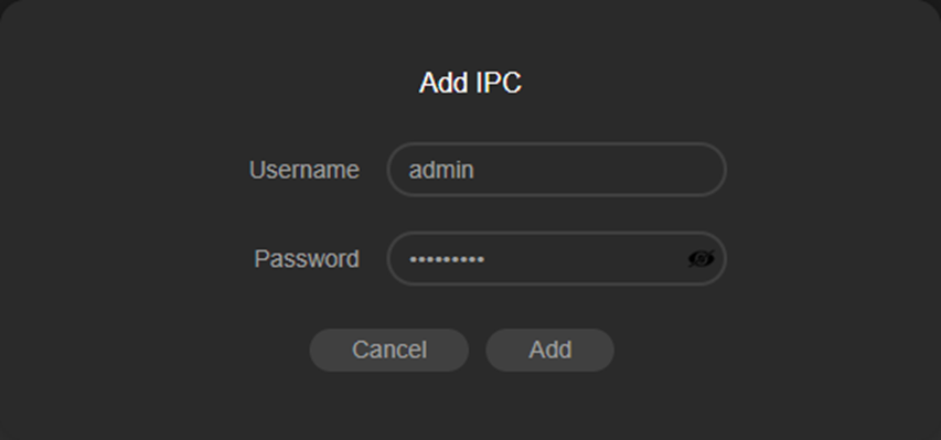 Vui lòng nhập lại đúng tên đăng nhập và mật khẩu để hoàn tất việc thêm IPC từ xa. Sau đó, trạng thái của IPC trong danh sách Device added sẽ chuyển sang “Connected” (Đã kết nối).