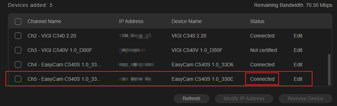 Vui lòng nhấn “Edit” để nhập mật khẩu IPC chính xác. Sau đó nhấn “Save”, trạng thái của IPC sẽ chuyển sang “Connected” (Đã kết nối).