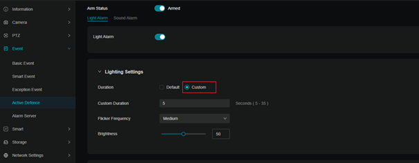 Đăng nhập vào giao diện quản lý web của camera IPC, vào Settings > Event > Active Defense. Chọn chế độ cảnh báo bằng đèn (Light Alarm) hoặc âm thanh (Sound Alarm), sau đó kích hoạt chức năng.