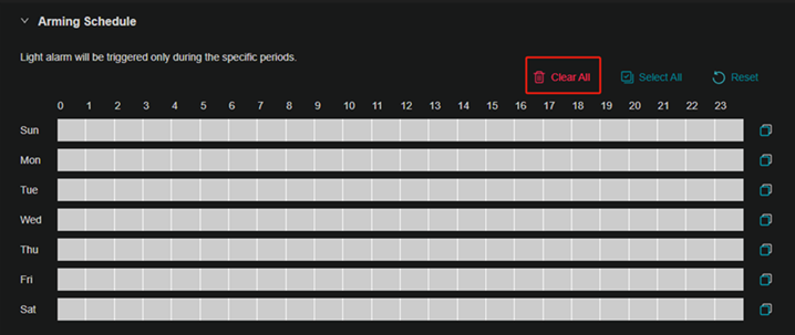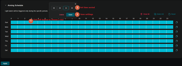 Bước 3: Kích hoạt cảnh báo bằng đèn, vào mục Light Alarm Schedule để cấu hình lịch cảnh báo. Mặc định timeline được chọn toàn bộ.