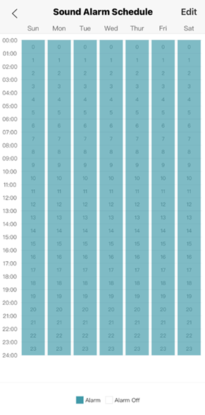 Bước 5: Vào mục lịch cảnh báo âm thanh (Sound Alarm Schedule) để cấu hình lịch. Mặc định timeline được chọn toàn bộ.
