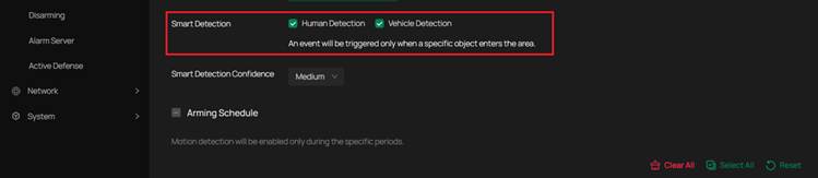 • Sau khi bật AI by NVR, bạn vẫn có thể bật Smart Detection khi cần. Khi Smart Detection (Phát hiện người/Phát hiện phương tiện) được bật, sự kiện chỉ được kích hoạt khi đối tượng cụ thể (người hoặc xe) đi vào khu vực giám sát.