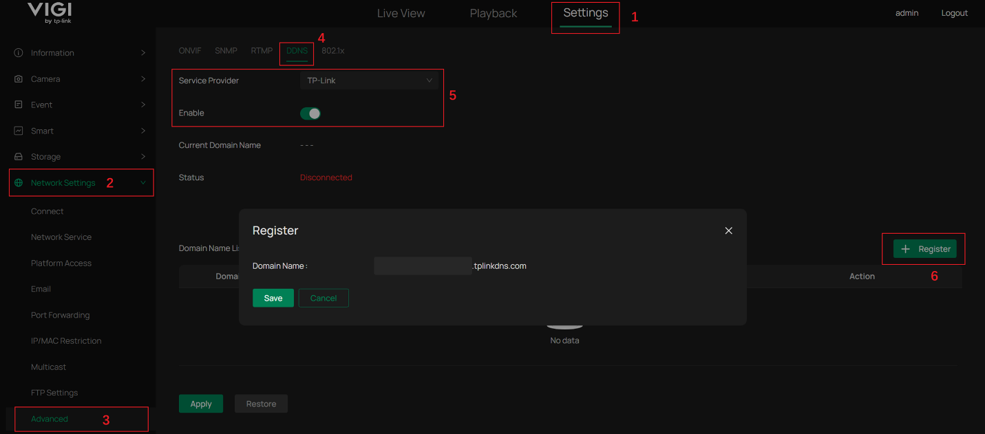 Vào Settings > Network Settings > Advanced > DDNS, bật DDNS, chọn Service Provider: TP-Link, nhập Domain Name, sau đó nhấn Save và Apply.
