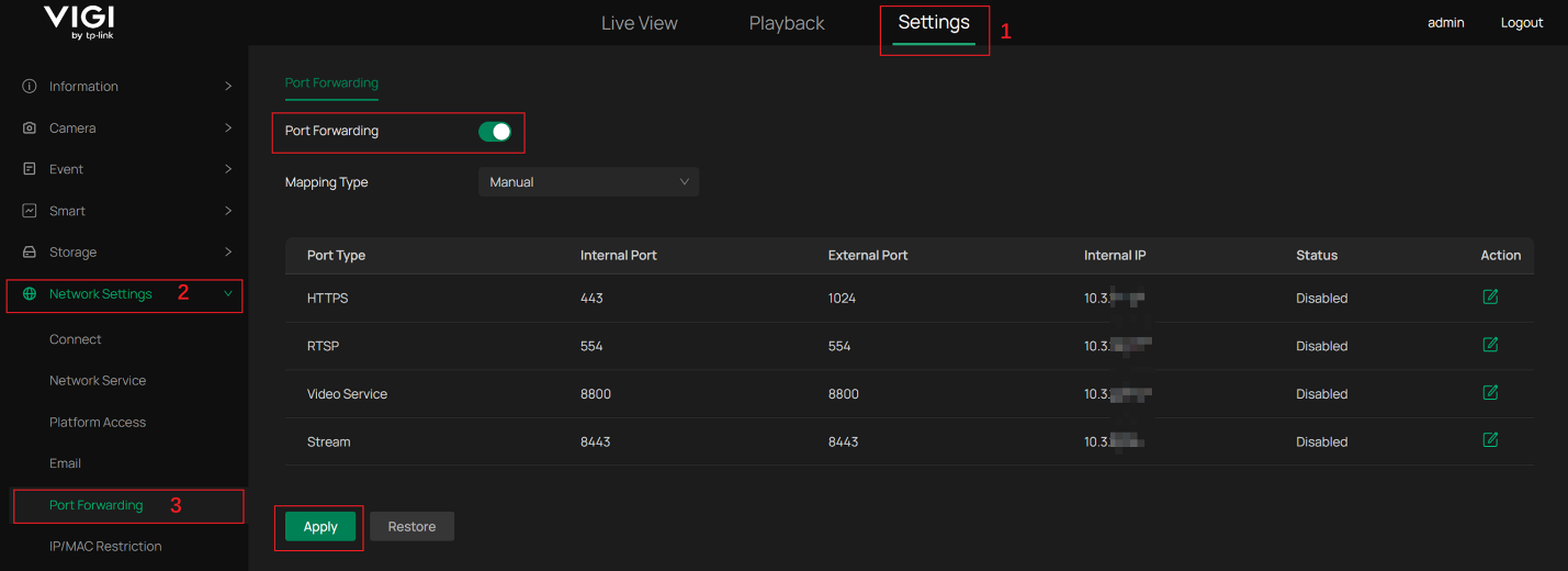 Vào Settings > Network Settings > Port Forwarding và bật Port Forwarding để ánh xạ các cổng nội bộ của IPC ra các cổng bên ngoài của mạng public. Kiểu ánh xạ có thể chọn Auto hoặc Manual.