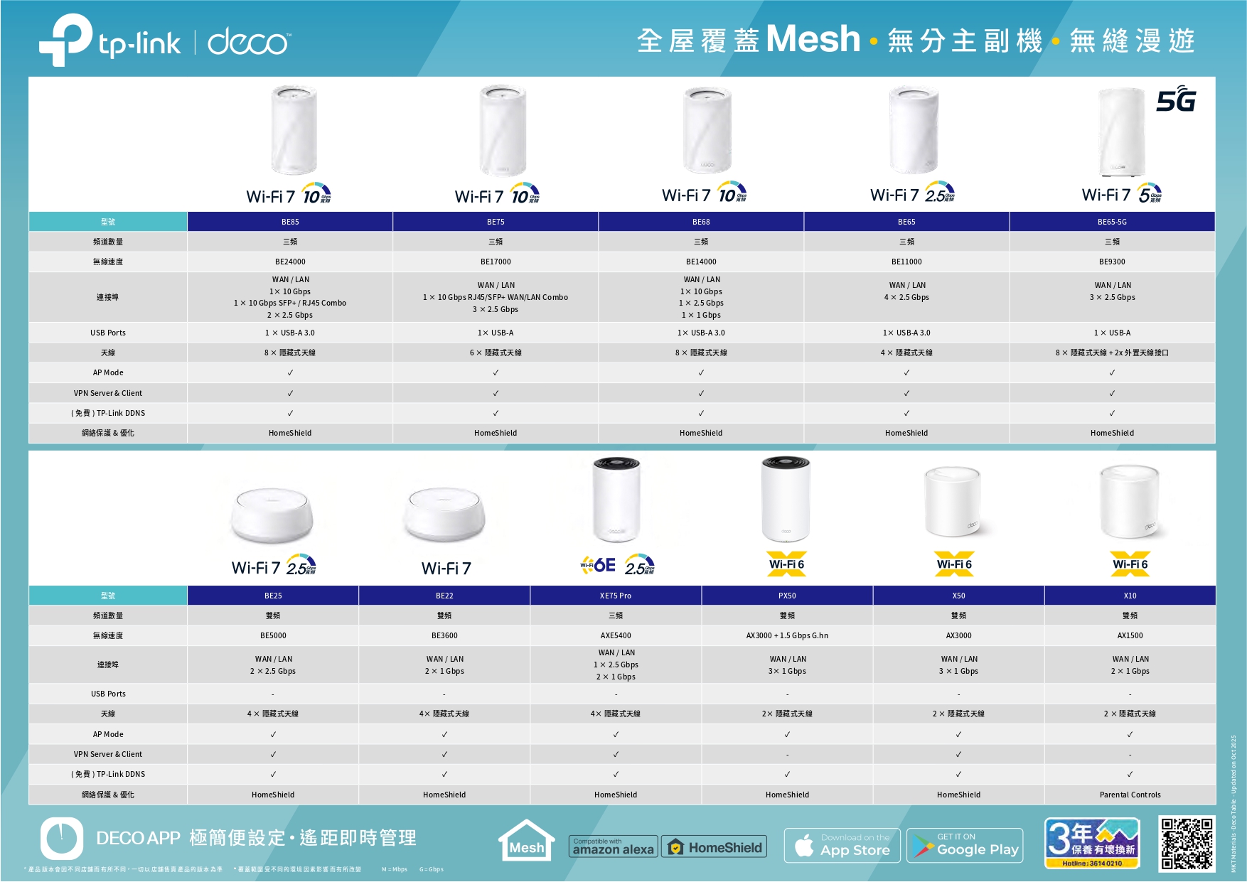 TP-Link Deco Mesh路由器產品 - 比較表
