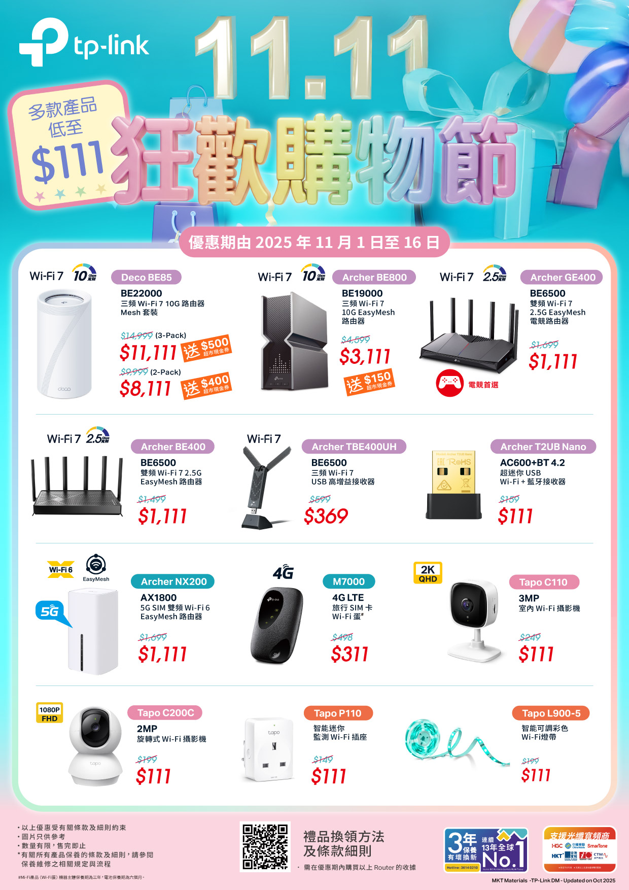 TP-Link 在雙11期間推出「狂歡購物節」限時優惠活動,涵蓋多款人氣 Wi-Fi Mesh路由器、智能攝影機及網絡產品配件等,部分指定產品低至 $111,為消費者帶來前所未有的超值選擇。