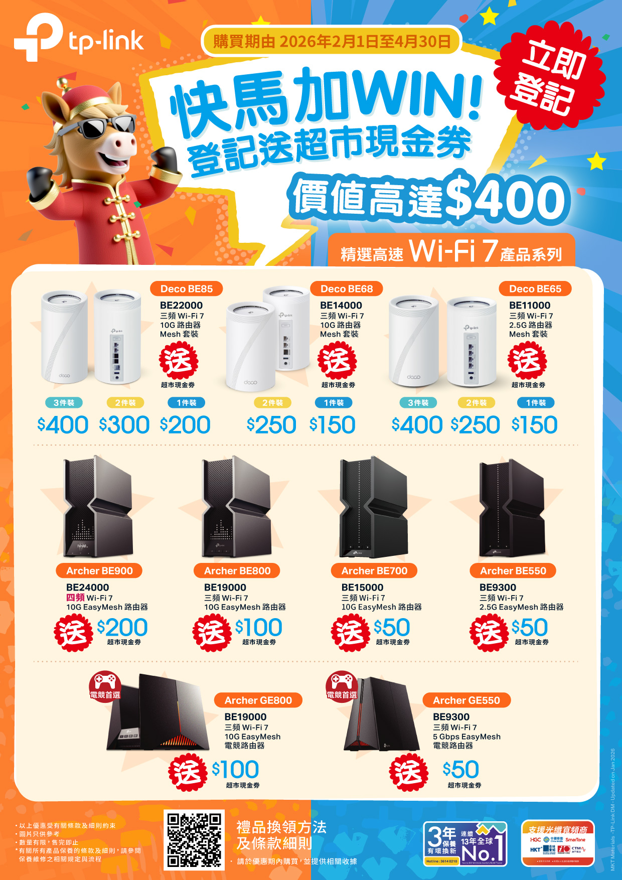 香港及澳門客戶可於2026年2月1日 至 2026年4月30日內,透過TP-Link指定經銷商網店及門市,購買Deco BE85、Deco BE68、Deco BE65、Archer BE900、Archer BE800、Archer BE700、Archer BE550、Archer GE800、Archer GE550,登記即送指定金額超市現金券,禮品數量有限,送完即止,詳情請向相應的經銷商或Facebook inbox查詢。