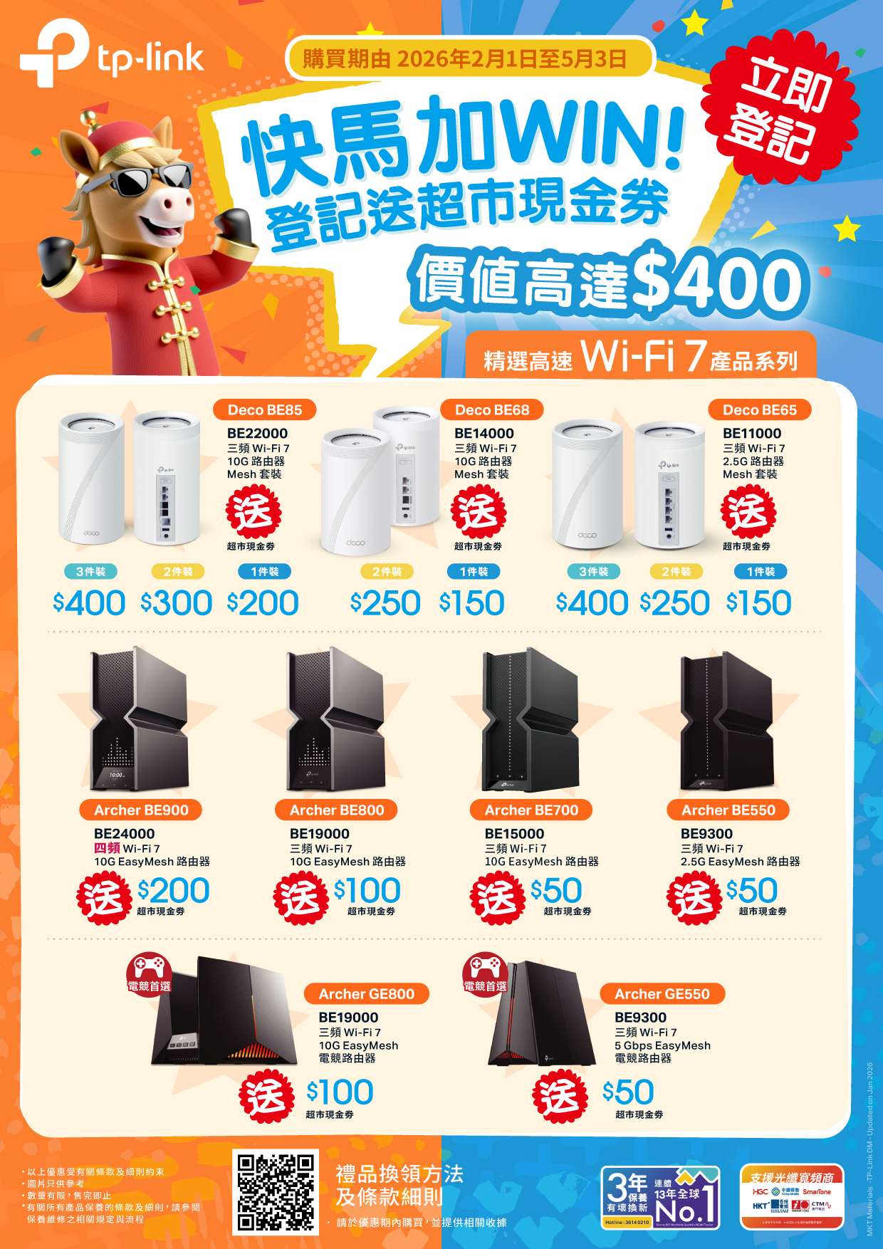 香港及澳門客戶可於2026年2月1日 至 2026年5月3日內,透過TP-Link指定經銷商網店及門市,購買Deco BE85、Deco BE68、Deco BE65、Archer BE900、Archer BE800、Archer BE700、Archer BE550、Archer GE800、Archer GE550,登記即送指定金額超市現金券,禮品數量有限,送完即止,詳情請向相應的經銷商或Facebook inbox查詢。