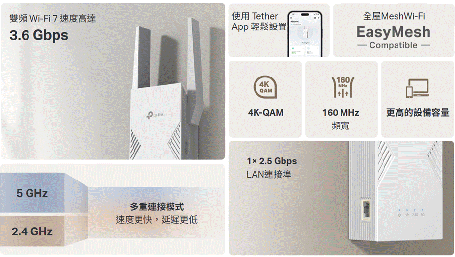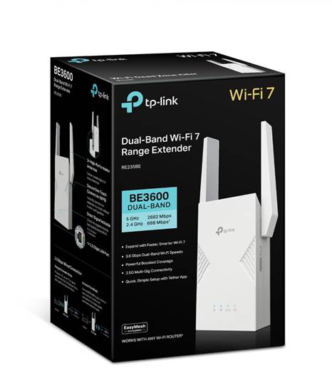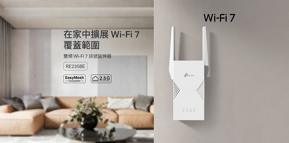 TP-Link Archer系列的路由器,大多數型號支援EasyMesh協議,RE235BE可對應相同EasyMesh協議,建立出無縫的Wi-Fi的網絡覆蓋,只需使用Tether APP一鍵加入,就可組合並使用相同的 Wi-Fi名稱(SSID),從此無論大廳或房間,都能夠無縫切換訊號接收來源,在家中一邊移動一邊可以無間斷地播放串流影片。RE235BE更搭載一個2.5 Gbps連接埠,於「範圍擴展模式」下,可當成高功率Wi-Fi 7接收端用LAN線連接到房間的電腦、電視、遊戲機;或以「接入點模式」透過有線連接路由器直接於房間發射出Wi-Fi 7訊號。