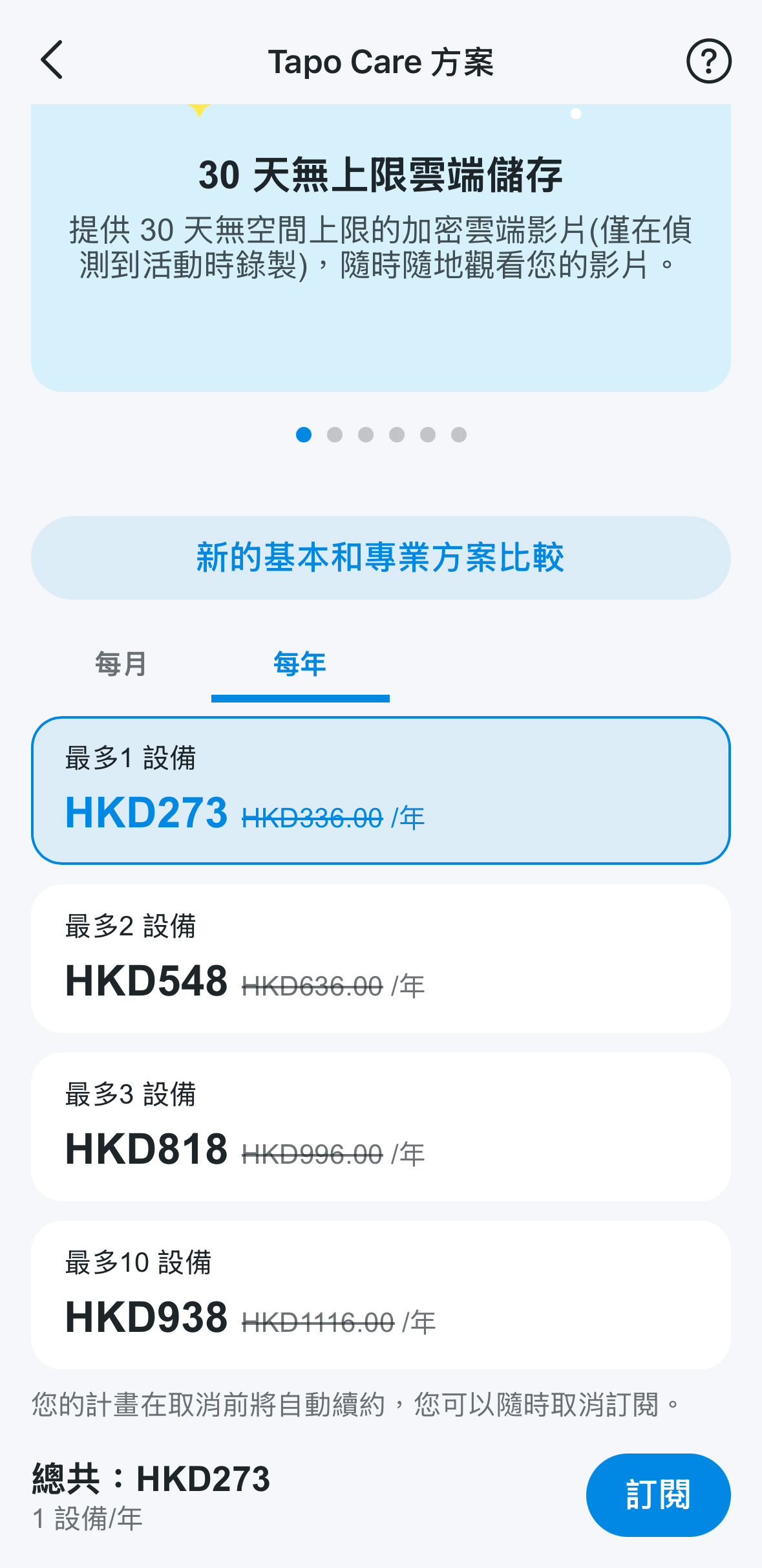 - 如果您正在使用 Tapo APP,請點擊「訂閱」以在 iOS App Store 或 Android Google Play 中繼續付款。