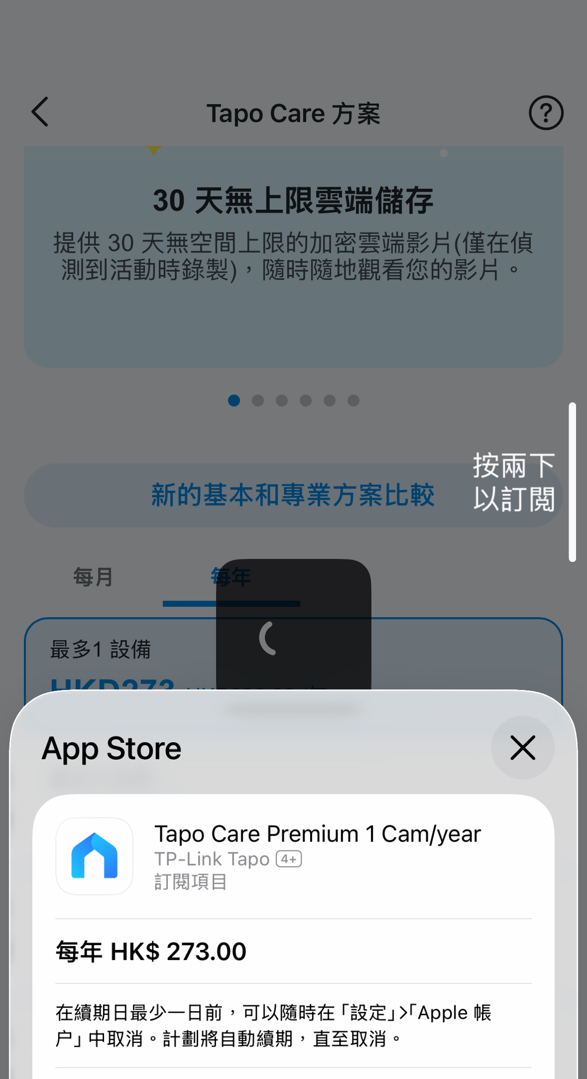 - 如果您正在使用 Tapo APP,請點擊「訂閱」以在 iOS App Store 或 Android Google Play 中繼續付款。
