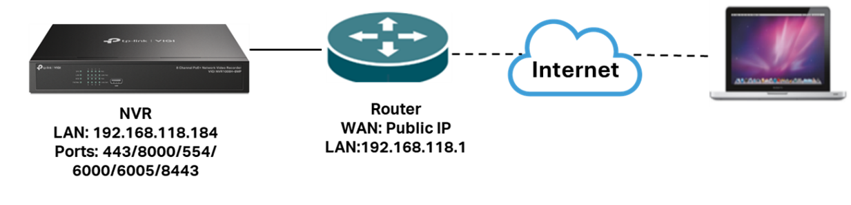 The NVR’s IP address is a Public IP address. A typical topology diagram is as follows:
